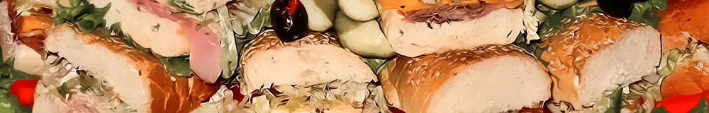 A tantalizing treat for the palate! Sandwiches featuring Ham, Turkey Breast, Swiss & Colby – with Tomato, Lettuce, Dills, Onion, Mustard & Mayo, folded into a soft steak roll then halfed, creating a tasty "Stuffed Sandwich." It's beautiful too!